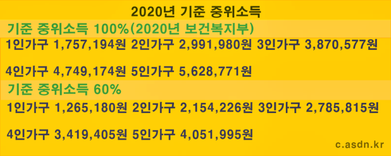 아래는 2020년 기준으로해서 기준 중위소득 100%와 60%에 해당되는 자들입니다.
